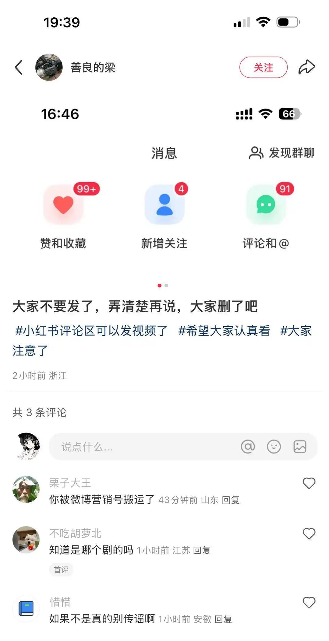 下午5点,一名网络昵称为“善良的梁”在小红书上发文,劝大家不要发了,在事情还没有弄明白之前,大家先把发的内容都删了, Ip地址显示是在浙江,头像也一模一样,但是不是聊天记录中那个人,这一点有待考证。