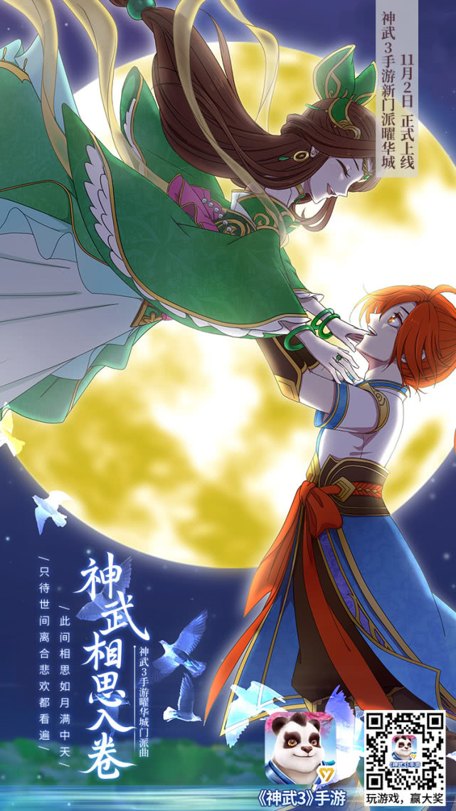 《神武3》手游有才玩家专门为其制作了多款国风海报——以叶青峰、凌霜月为主角的系列海报,从两人对坐戏水的郎情妾意,到凌霜月独坐花海期盼良人归来,到月圆之夜有情人再度团圆等多个方面入手,与主题曲《神武相思入卷》交相辉映,无论是两小无嫌猜的岁月静好,还是倚门期盼良人归来的娇羞惆怅,抑或是有情人终成眷属的大团圆结局,都仿佛画出了《神武3》手游中玩家的动人爱情。