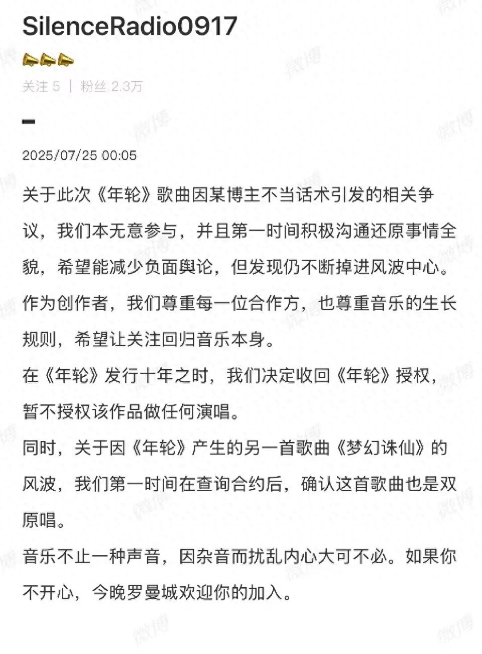 汪苏泷方面迅速做出回应,宣布收回《年轮》的所有商业演唱授权,并明确表示不再允许任何翻唱,同时指出《梦幻诛仙》这首歌是双原唱。