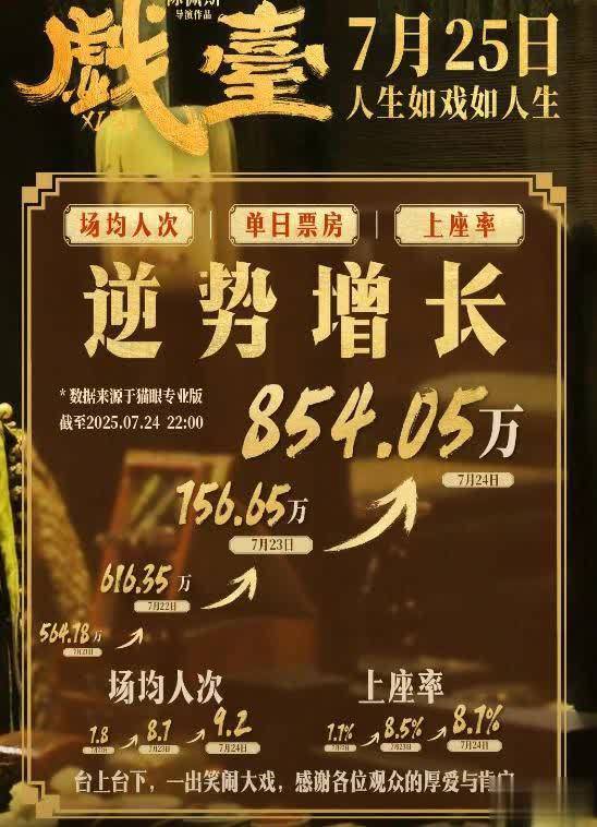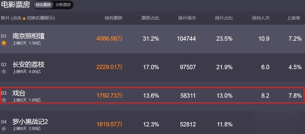 而从上座率来看,《戏台》已经超过了前两名,后劲也十足,有不少观众都在二刷,很多院线经理也反馈称,《戏台》的喜爱度在飙升,观众热情很高,这样看戏台后期有望被院线加场次。