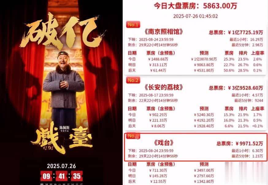 在点映期间,《戏台》的口碑逆势而涨,看过电影的无不夸赞好看,更有无数老一辈陈佩斯影迷口口相传,最终硬是在点映一周期间将票房从一开始100多万,硬生生提升到正式上映前的854万。而7月25日上映后,更是在第二天就票房破亿元。