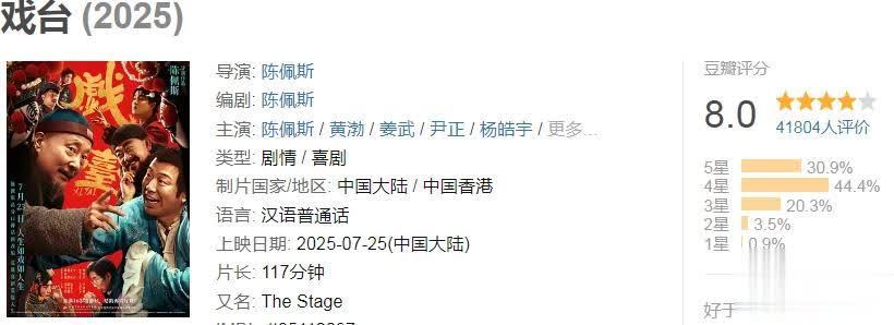 目前,《戏台》的在某瓣上开分8.0分,算是十分高口碑的分数,不少观众看完后,直言电影十分好看,是久违的陈佩斯风格,讽刺意味也拉满了,且看完后让人久久有回味,也有感动。