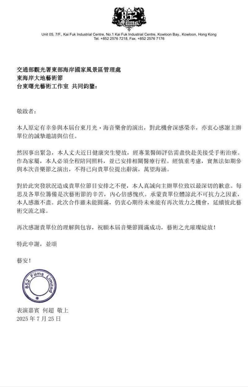 何超仪原本要在2025年8月参加在台湾举办的音乐节,不过日前她已经提出了辞呈,取消了演出。何超仪很重视这次的演出,在决定辞演了之后,还以公文的形式通知主办方。在文中她表示事出紧急,丈夫(陈子聪)近日健康发生变故,经过专业医师评估需要尽快赴美接受手术治疗,作为家属需要全程陪同,所以无法参加音乐节,故此提出辞演。何超仪辞演的原因与丈夫患病有关,她也没有隐瞒,直接公开陈子聪突然患病,并且情况紧急,不过何超仪没有透露陈子聪此次的具体病况。