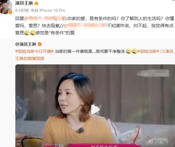 7月30日,王琳晒出自己在综艺《姐姐当家》里的视频片段,视频中,王琳表示“当家的第一件事就是房间要干净整洁”有网友回复称“不知道咋说,对不起,我觉得有点窒息,感觉是“有条件”的爱” 随后,王琳转发回怼“你家的爱,是有条件的吗,你了解别人的生活吗,你懂爱吗,窒息,快去吸氧”