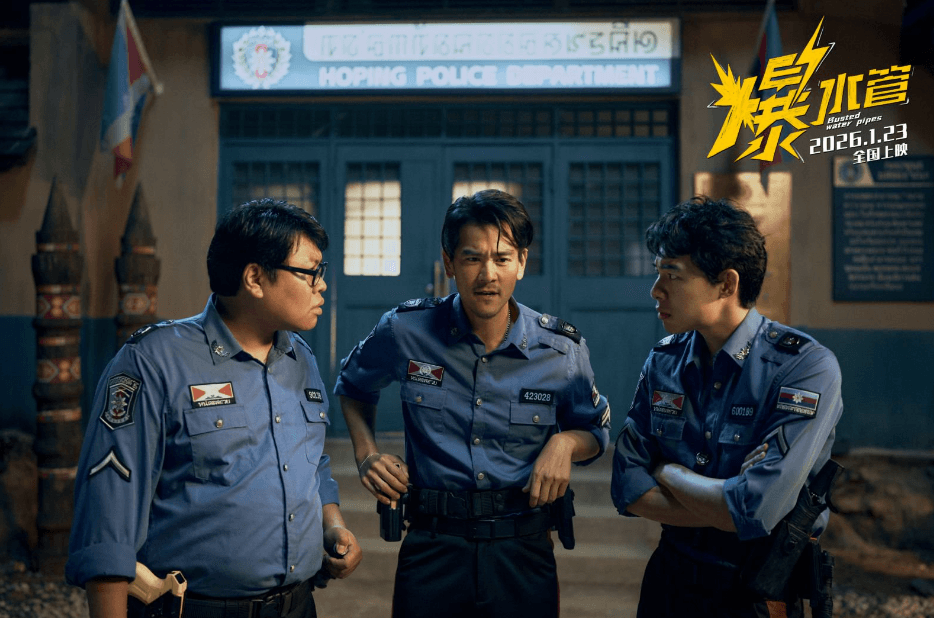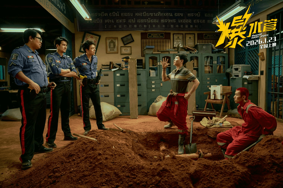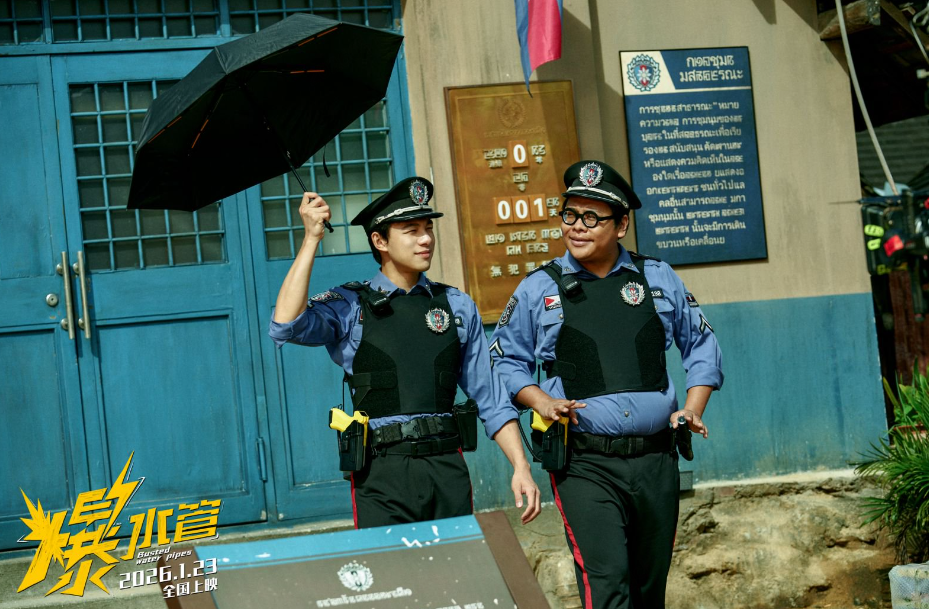 在电影《爆水管》中还有一群与和平镇精神状态十分契合的“特殊旅客”,他们正是前来投奔亲戚罗四季的罗浩(周游 饰)、牛大轮(闫佩伦 饰)等祖传盗墓家族。他们来到和平镇开拓“海外业务”,盯上了一座藏在警局之下的古墓。而此时东南亚警察们正因治安太好即将失业,于是他们决定自己造个大案。视频中,伪装成水管工的罗浩和牛大轮,已正带着队友挖宝的于大海在警局正面相遇,一起“和平镇史上最大案件”一触即发。让我们一起相约和平镇,开年爆笑,夯级解压,影院揭晓!