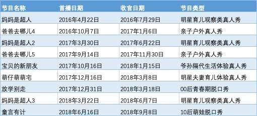 《爸爸去哪儿》第五季收官后,芒果TV没有让亲子类节目产生空白,陆续推出隔代生活体验真人秀《宝贝的新朋友》、明星夫妻育儿体验真人秀《萌仔萌萌宅》,00后青春期脱口秀《放学别走》。2018年,《妈妈是超人》第三季回归,10后萌娃脱口秀《童言有计》上线。