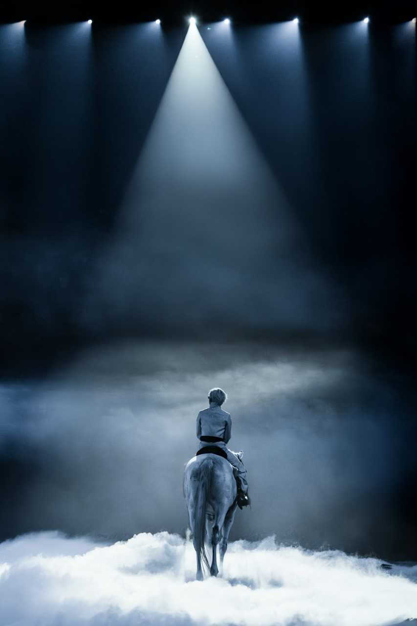 随后,周震南以一种极具诗意的、近乎行为艺术的方式登场——在一片刻意营造的寂静中,他身骑白马,从雾霭中缓缓步入观众视野。摒弃了所有喧嚣的声光电轰炸,以极简和悬念,将“舞台”的概念从固定的物理结构中解放出来,延伸至整个场馆空间。