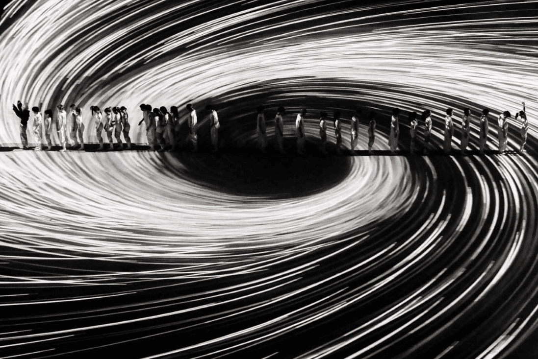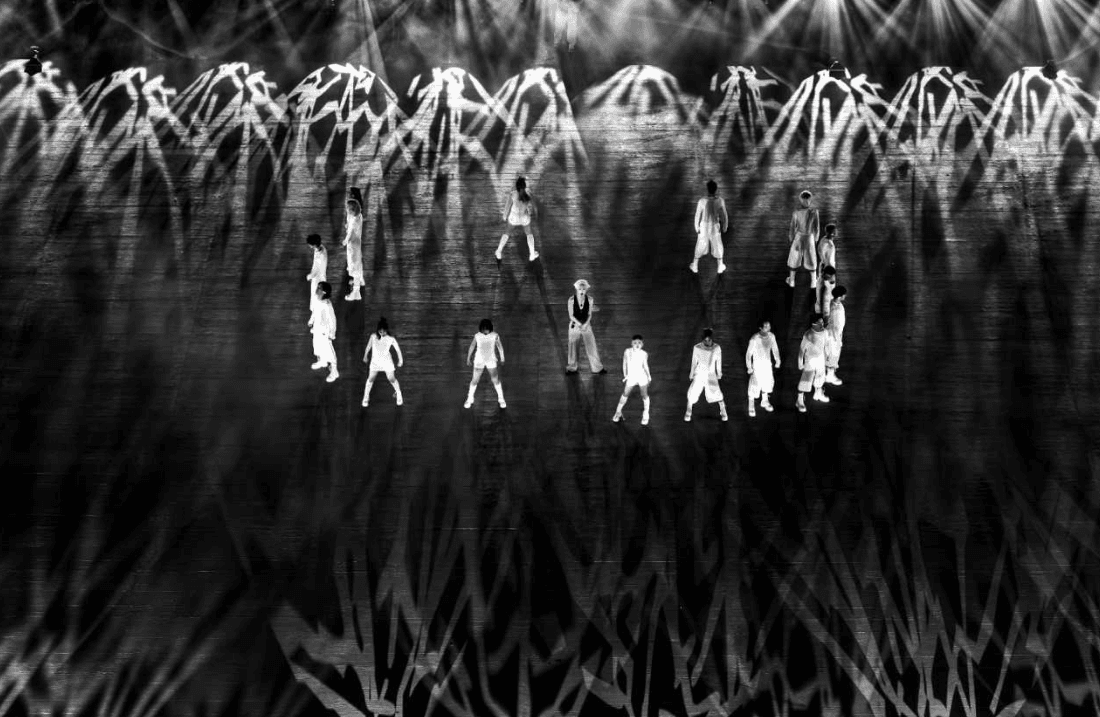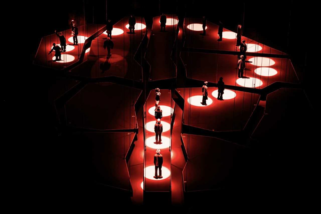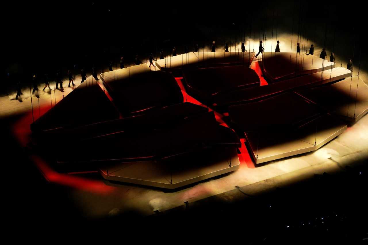 取消传统舞台并非意味着表演的降级,而是对表演维度的升维探索。在周震南的舞台空中藏着十二片可以从天而降的龟裂形态的空中舞台结构,观众入场时无法看到它。它像尚未被察觉的信念与觉知,被暂时悬置在视野之外。龟裂并非破坏,而是意识在经历迷雾、反复、自省之后,自然产生的裂缝。这些裂缝,让光、影、声音与情绪得以渗入。