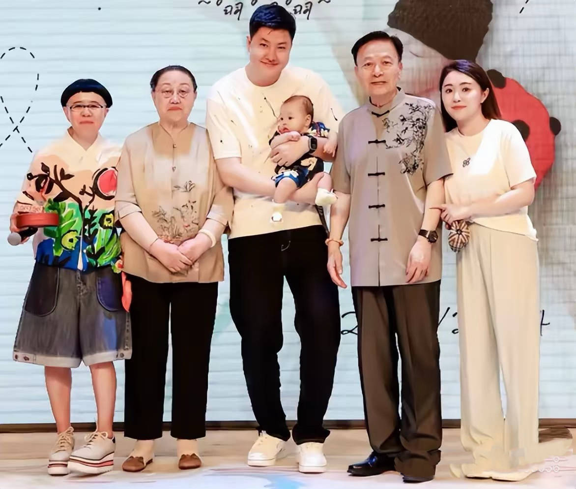 金宝刚出生时,一家人也相聚拍照留念。刘青林的大高个极为出众,看起来比岳父王宁还要高出一截。