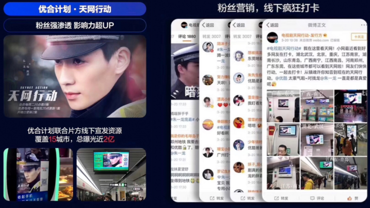 作为文娱内容行业生态营销排头兵,优酷在花样翻新,竞争激烈的网络背景下,我们看到了《天网行动》在剧集内容营销上的一些节奏型打法。同时伴随着优酷开放平台“优合计划”发布,亿级曝光资源赋能行业合作伙伴优质作品营销传播,促进品牌用户下沉,建立起线上与粉丝的新型关系模式,让“天网”曝光用户覆盖率稳健上升,着实通过线下触达穿透,线上话题造影响在微博、百度、超话、朋友圈“火”了一把。