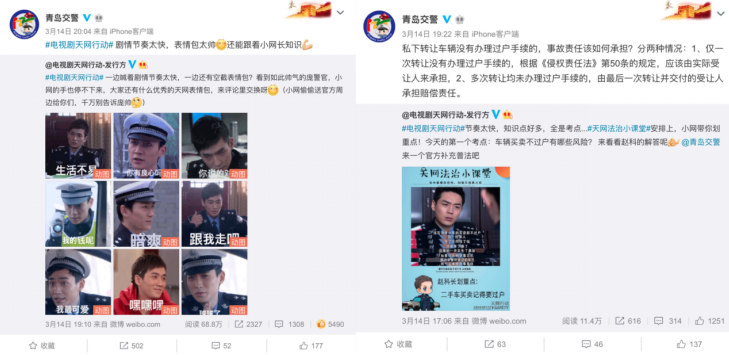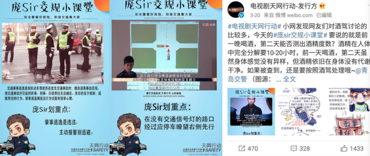 部分公安交管部门注意到该剧爆发出的网络普法热潮,对此剧的现实意义大力支持,乃至后来官方蓝V青岛交警、江宁公安在线等在线参与讨论,矩阵联动传递社会价值,大大提高了影视剧的受众覆盖人群,改观群众态度心理,全方位拓展观剧用户数量。使得《天网行动》从人群中走出,再走进人心中去,也使其更加广泛化,群众化。