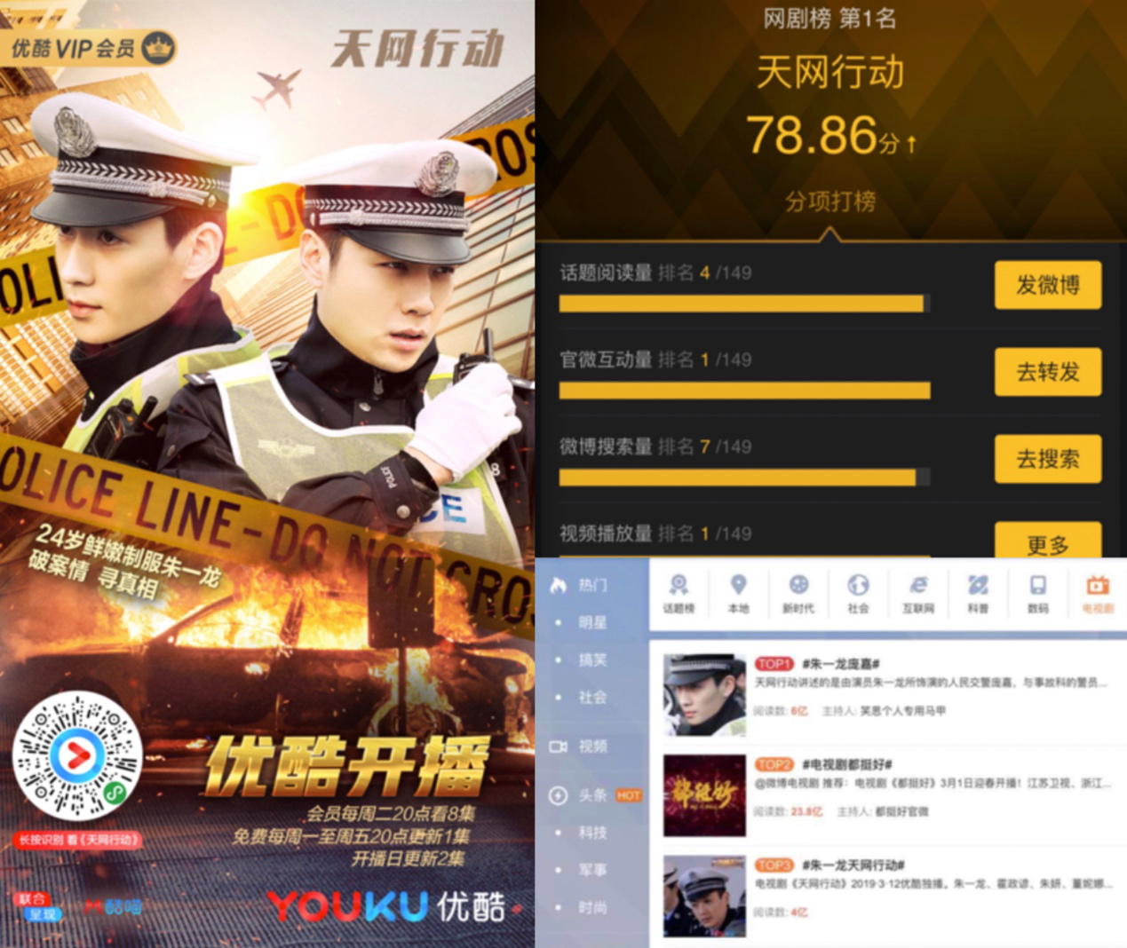 今天,小编就为大家介绍正在优酷热播的朱一龙新剧《天网行动》,是怎么通过一系列的营销新思路,为一个带着2012年拍摄的老剧用户偏见的剧集,开拓他的目标用户分级消费市场,让这部剧口碑和热度齐飞。