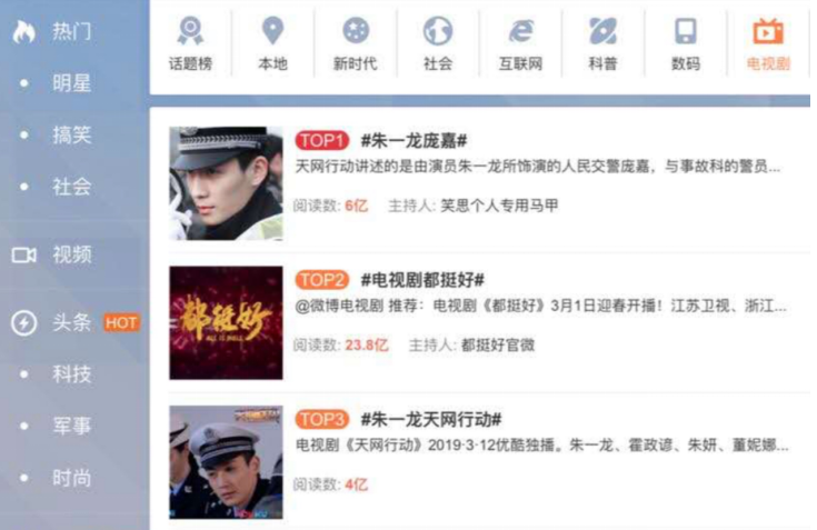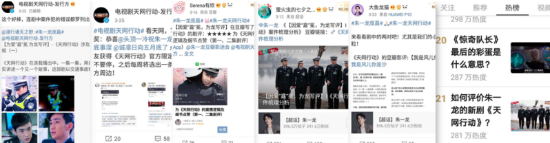 在微博方面,本剧关注及讨论热度居高不下,微博电视剧、芭莎男士、思想聚焦、凤凰网娱乐等大号纷纷安利,联合微博台网、微博电视剧的大力线上支持,朱一龙娱乐圈好友及许多艺人在各大新浪新闻新浪圈子首页力荐《天网行动》。一周电视剧报告里朱一龙饰演的庞嘉获得角色提及量热度第一。