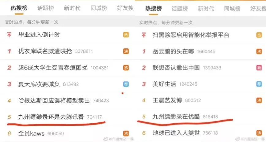 甚至还不惜花钱买了热搜“九州缥缈录在优酷”、“九州缥缈录还是去腾讯看”battle ▽