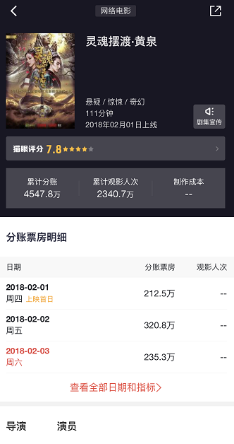 由徐冬冬主演的另一部网大《狄仁杰之夺命天眼》表现同样出色,在优酷2018年10月分账榜上位居第2名,在2018年年度分账榜位居第3名,影片上线92天,分账金额已高达3252万,距离现今已有一年之多,金额数字不敢想象;