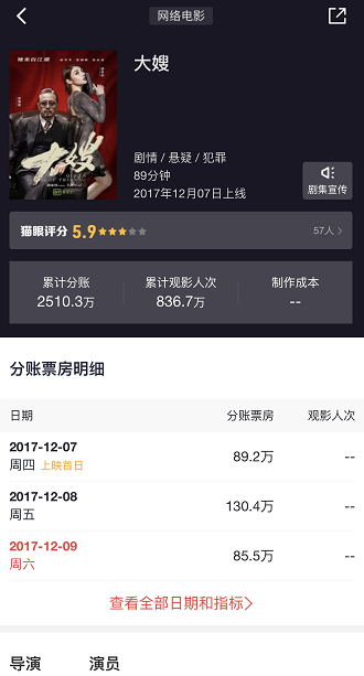 由其领衔主演的同名网络大电影《大嫂》热映一年半,累计分账金额2510万,观影人次836万,连续多月蝉联网络电影排行前五,该片无论是制作成本还是可观看延续性亦或是投资回报都绝非一般网大所比拟的;