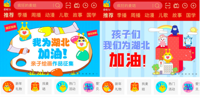不止在充实孩子寒假生活上发力,金鹰卡通和旗下亲子视频流媒体平台麦咭TV一起,联动全国少儿电视台,发挥新媒体传播优势,策划“与爱童行,为湖北加油”活动,号召全国的孩子们向武汉的孩子说出心里话,为武汉加油,为湖北加油!其中包括了《我为武汉加油》亲子绘画作品征集和视频征集等。看!孩子们用稚嫩的笔触,纯真的声音守望英雄、声援医护、抚慰民心。金鹰卡通用这种特别的方式鼓舞“逆行者”们迎难而上,打破一个又一个的“不可能”,展现金鹰卡通亲子中国第一平台的责任和担当!